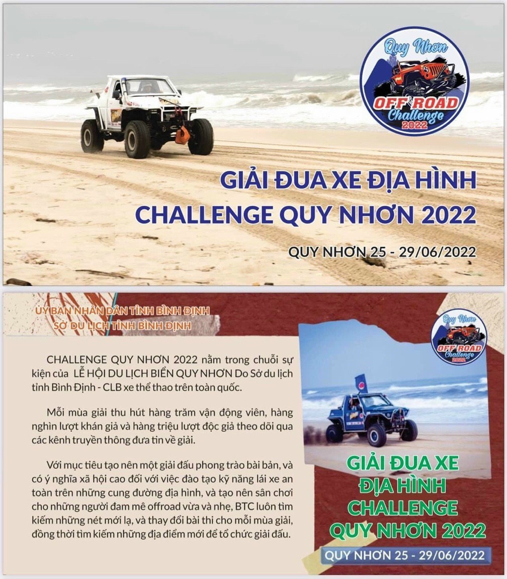 Hưởng ứng chương trình Lễ hội Du lịch Biển Quy Nhơn - Bình Định năm 2022, được sự chỉ đạo của UBND Tỉnh Bình Định, dưới sự chủ trì của Sở Văn hóa và Thể thao Bình Định, phối hợp với Sở Du lịch Bình Định, Công an tỉnh Bỉnh Định, UBND thành phố Quy Nhơn, Công ty TNHH Hana Events tổ chức giải: Đua xe địa hình“CHALLENGE QUY NHON 2022 ”